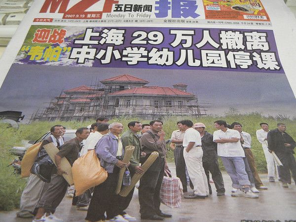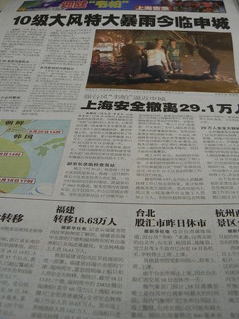 一夜过去了, 雨也停了.看来台风真的回家喝酒了. 这是收到饭否消息, 说南京大雨. 我就打开电视. 记者正在金山区现场报道, 说台风还没抵达上海, 不过金山已经出现了大风.
