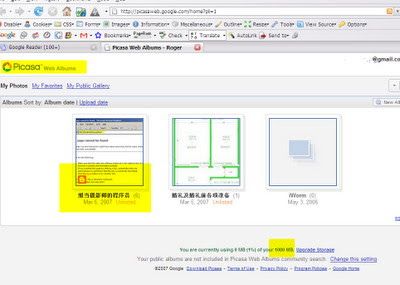 如图所示, Blogger会在你的Picasa中建立一个以你Blog名字命名的相册, 里面存放的就是你在Blogger上上传的图片.这个功能不错, 看来Google开始慢慢整合自己的产品了. 就像Gmail和Google Calendar的整合一样.