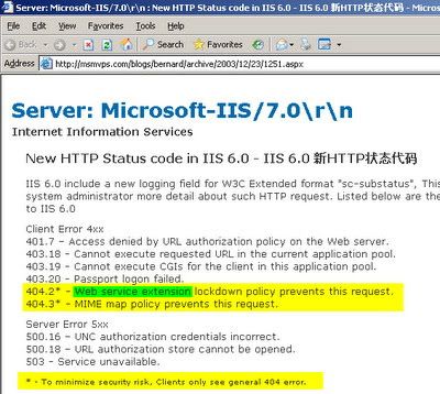在Google里面搜索" IIS Denied due to Lockdown Policy", 会发现这篇文章, 上面提到了"404.2* - Web service extension lockdown policy prevents this request." 当我看到"Web service extension"这几个字的时候就想到了IIS里面也有这个东西.
