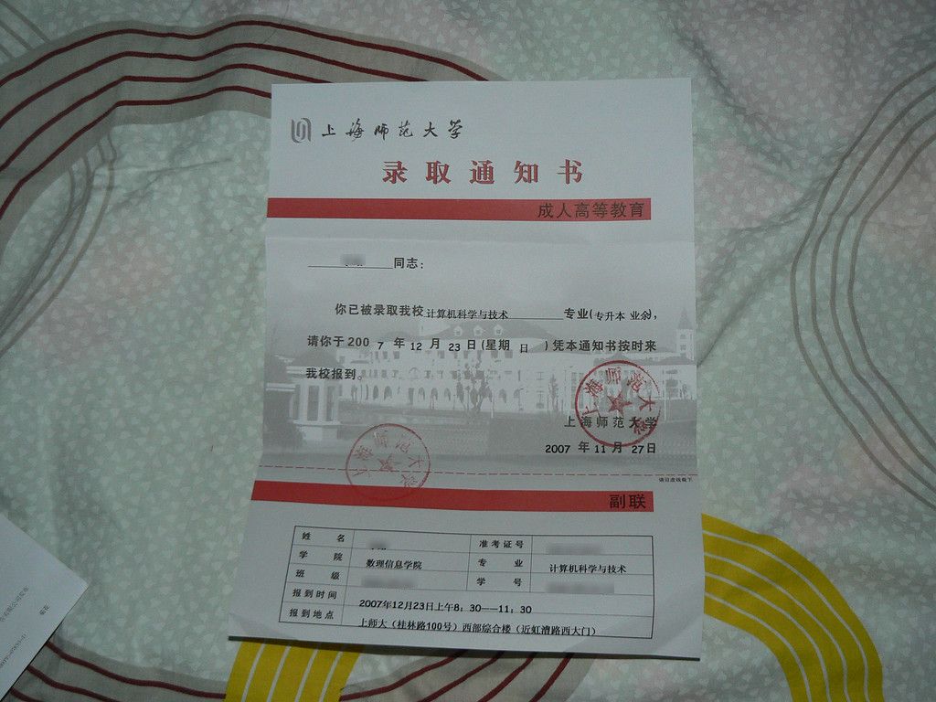 哈哈,经过一阵紧张的复习,终于拿到了上师大的夜校本科录取通知书。